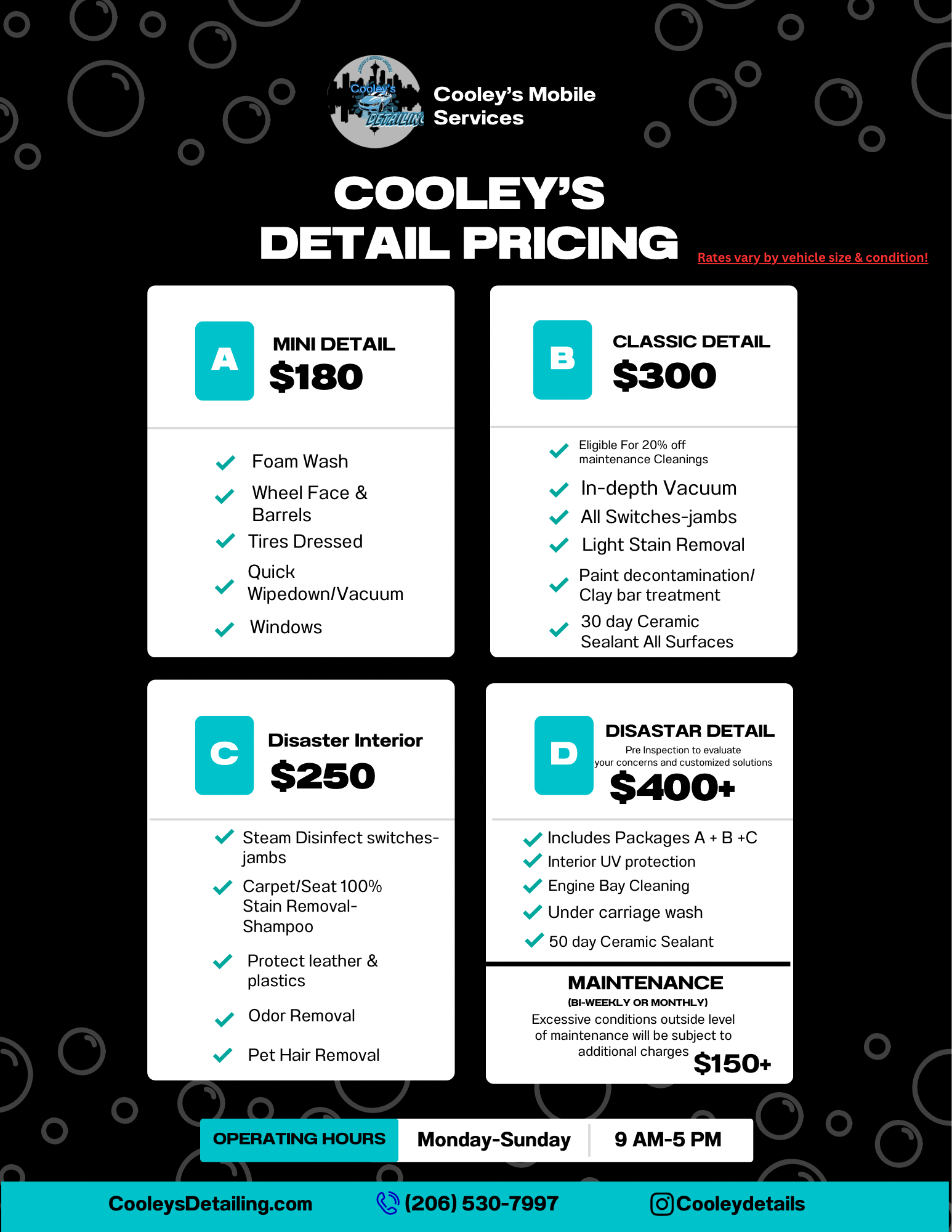 Serving the Seattle and Tacoma area with pride, we provide reliable, affordable car detailing for vehicles of all makes and sizes. From our garage or at your doorstep, our goal is simple — to make your car look its absolute best.